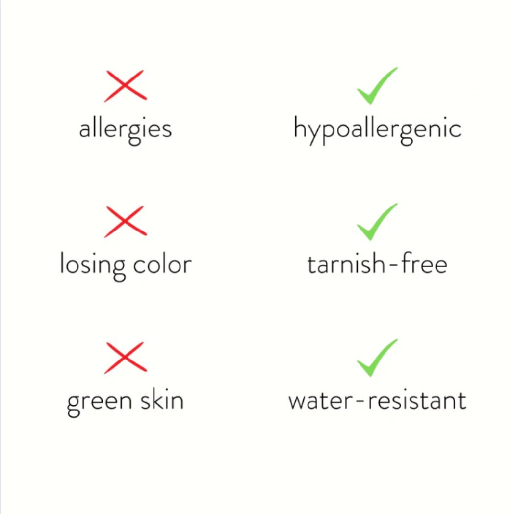 ¡Hecho de acero inoxidable impermeable, nunca más tendrás que preocuparte por joyas que se descoloran o se empañan!